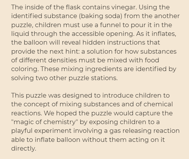 "Future’s Brightest Scientists" was showcased during Culture Night 2019 at the IT University of Copenhagen and was the first prototype created during my research stay at the Center of Digital Play. The experience involved a chemistry-themed Escape Room designed to prompt children to "think like scientists". Play sessions lasted 30 minutes, involved 3-5 participants and took place in a pop-up chemistry laboratory. The goal was not to "escape" but to reach a specific product: a density column with three stacked solutions in different colors. Children solved puzzles involving the same methodical procedures that scientists use on a day to day basis: they created and used instruments to make scientific measurements, they recorded and analyzed data, they communicated and synchronized tasks, etc.